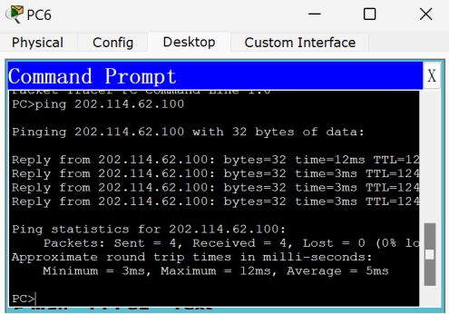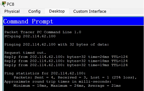 (2)PC1->PC5不通。由于阳新支行A网点的计算机全部采用内部私有地址,因此内网PC能够顺利访问外网服务器但外网不能够访问内网主机,也就是说PC5可以ping通PC1,但PC1不能ping通PC5: